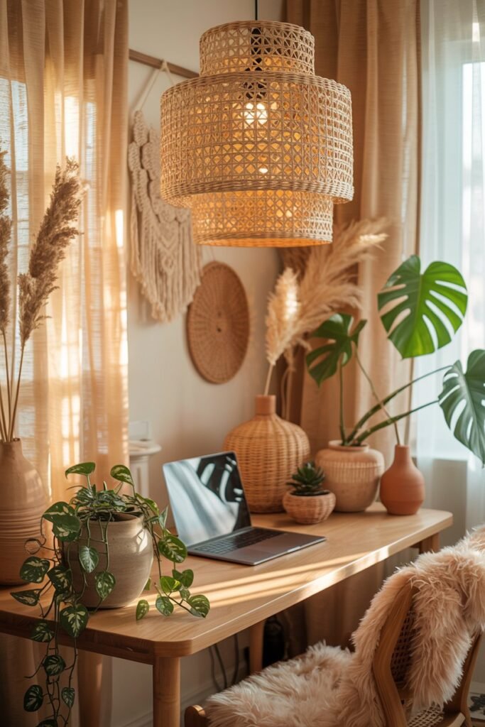 Boho style thrives on natural light. Sheer or linen curtains soften sunlight, creating a gentle, calming glow that’s ideal for long work hours.