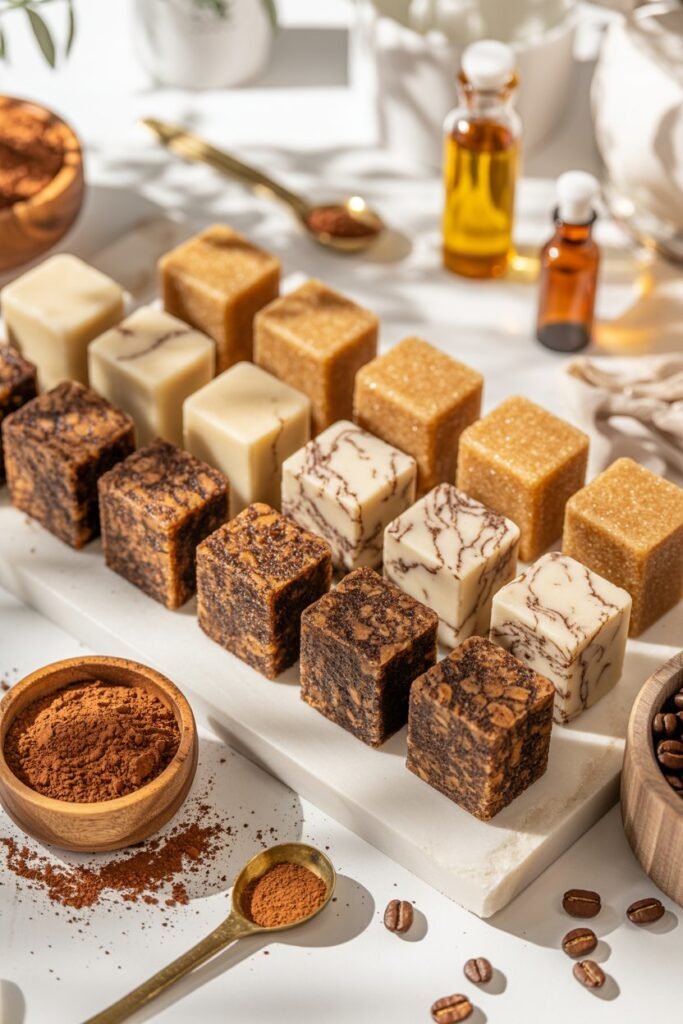 Coffee sugar scrub cubes are solid, cube-shaped exfoliators made with natural ingredients such as sugar, coffee grounds, oils, and optional essential oils.