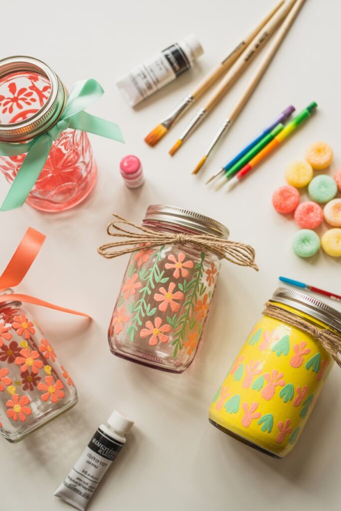 - Paint designs directly onto the jar — stripes, ombré effects, polka dots, or abstract patterns work beautifully.