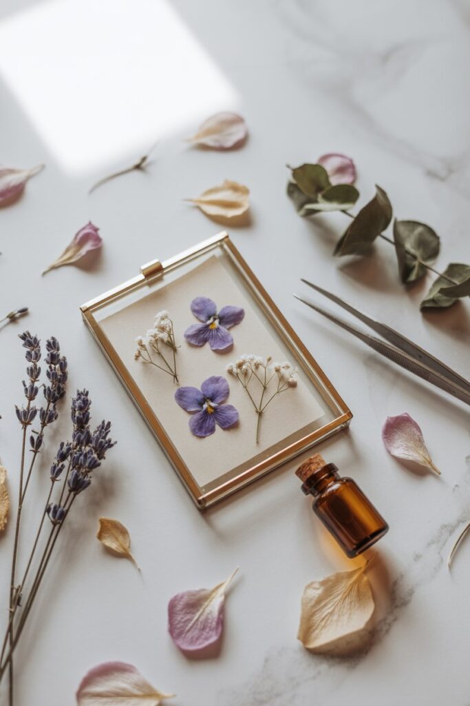 - Arrange your dried flowers on one pane of glass. Layer petals or stems to create depth and visual interest.