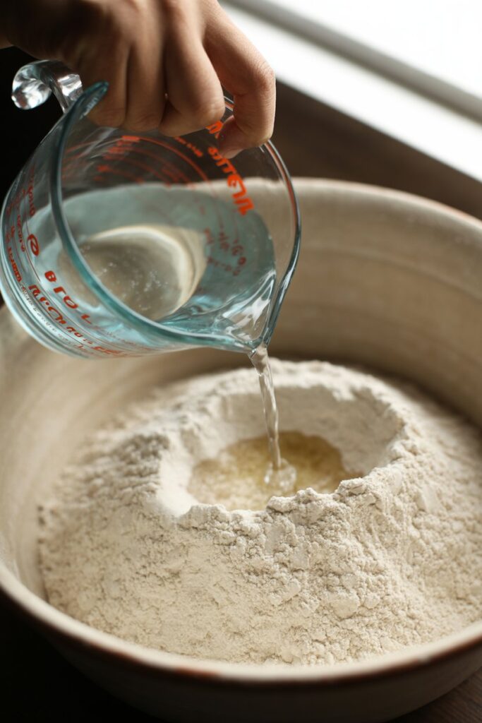 Next, I slowly pour in about 3/4 cup of water. I like to add it a little at a time while stirring, so the dough comes together without becoming sticky.