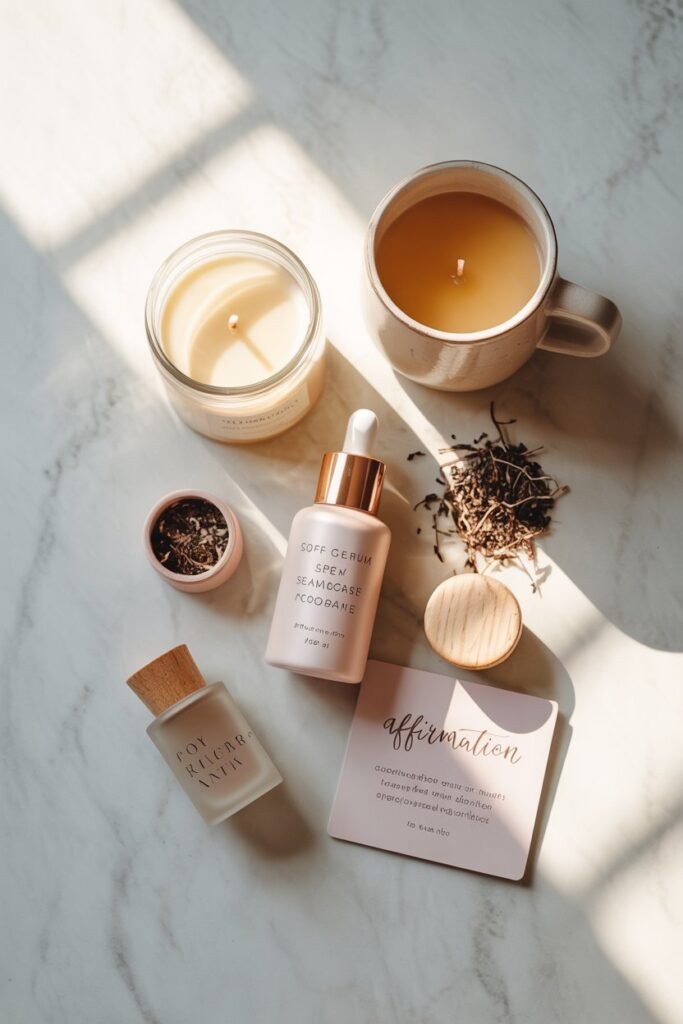 For example, in a relaxation gift box, I might include a candle, herbal tea, a soft sleep mask, and an affirmation card.