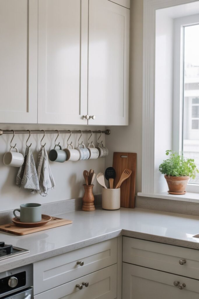 Use the space under your upper cabinets to add hooks for hanging items like mugs, towels, or even pots and pans. It’s an excellent way to free up counter space while keeping your kitchen essentials within reach.