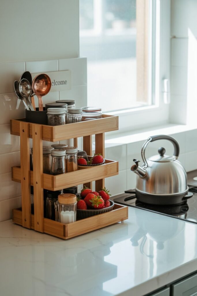 Tiered organizers are a great way to keep your kitchen counters organized while maximizing vertical space. Use them to store fruits, condiments, or even cleaning supplies.