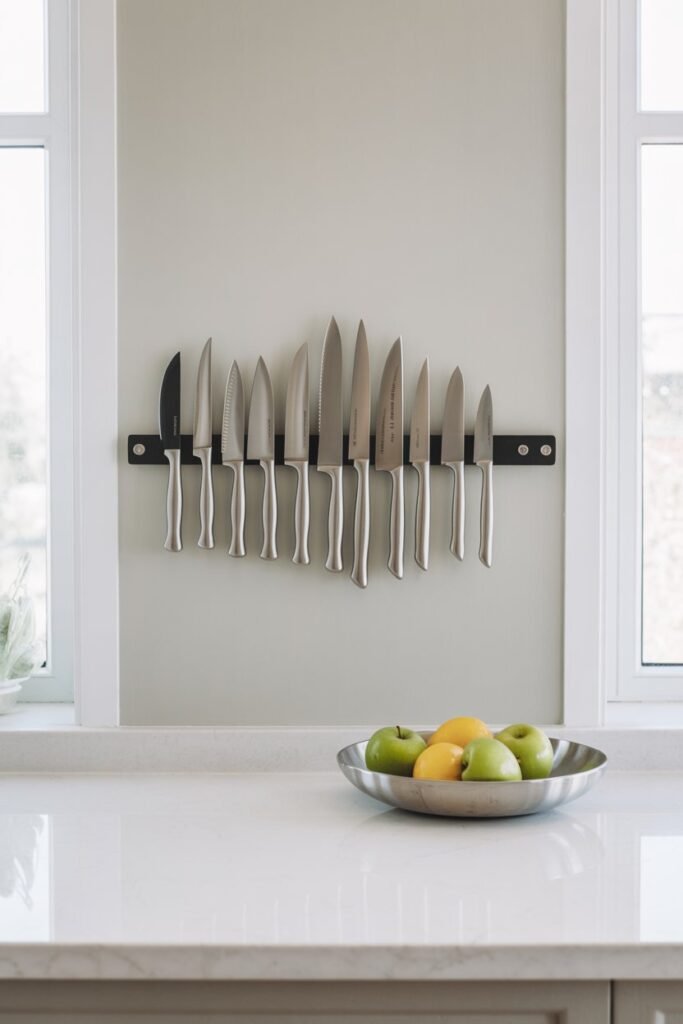 Instead of taking up precious counter space with a knife block, install a magnetic knife strip on your wall. It’s an elegant and practical solution for keeping your knives accessible while freeing up space on your counter.