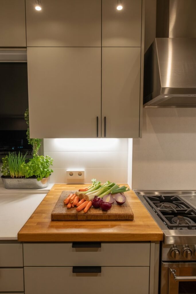 A large wooden or marble cutting board not only provides ample space for meal prep but also adds a rustic charm to your kitchen. It can serve as a decorative piece when not in use, and you can easily move it when you’re ready to cook.