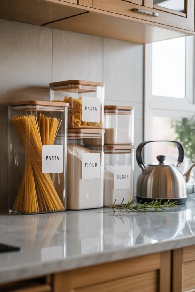 Keeping your kitchen counters neat and organized is all about storage. Transparent storage containers are a sleek way to store ingredients like flour, sugar, or pasta. Not only do they keep your counters organized, but they also let you easily spot what you need while cooking.