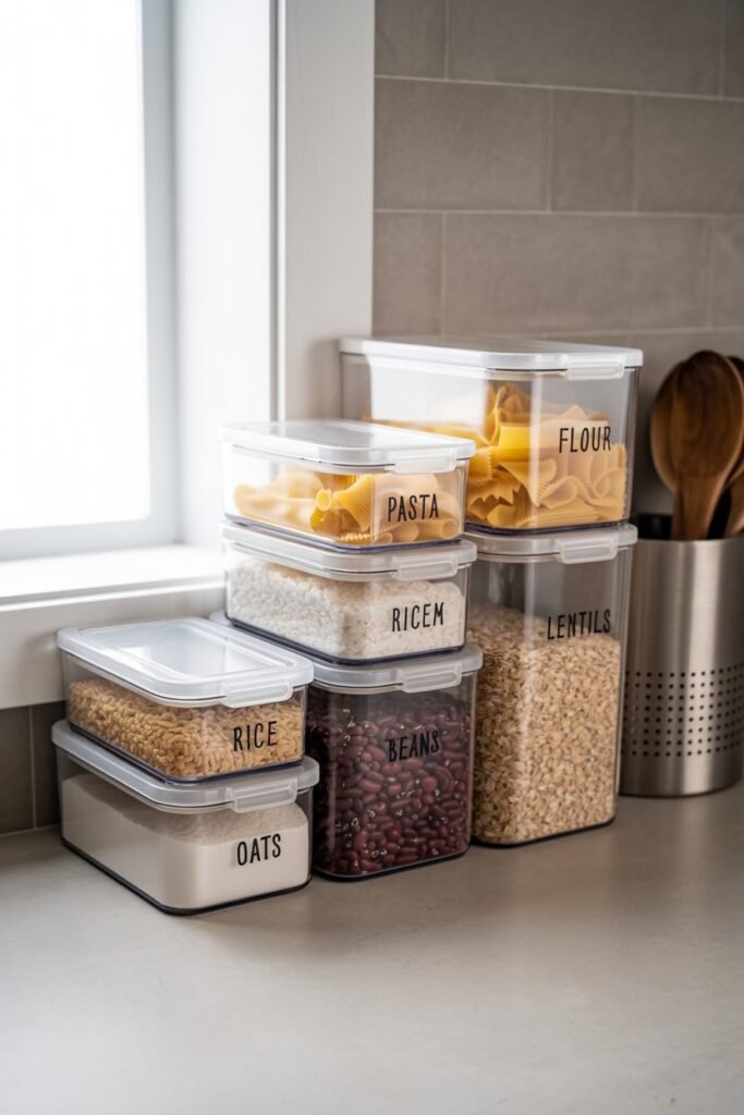 Stackable containers are perfect for storing dry goods like cereal, pasta, and flour. They take up less space and are great for keeping your pantry organized, so you don’t have to clutter your counters.