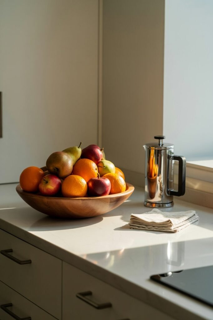 A simple fruit bowl on the counter adds life to your kitchen while keeping your fruits and vegetables within easy reach. Opt for a stylish, minimalist bowl to match your kitchen’s vibe.