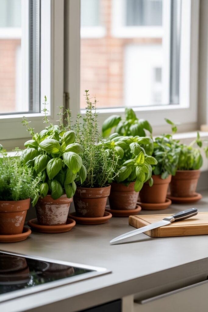 Growing fresh herbs on your counter is not only practical but also adds a touch of green to your space. Small potted herbs like basil, thyme, and mint are easy to grow and look beautiful in your kitchen.