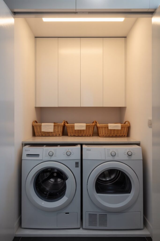 Adding a wooden or laminate countertop transforms this area into a functional workspace for folding clothes right after they come out of the dryer. It’s practical, space-saving, and instantly elevates the look of your laundry area.