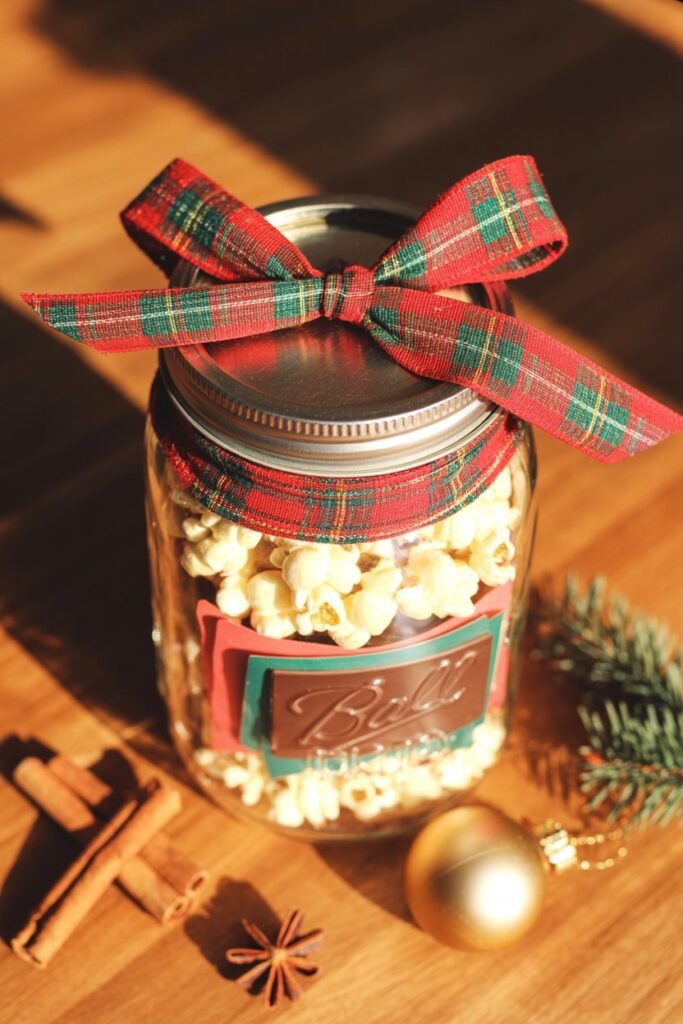 - Fill a 32 oz jar with microwave popcorn, mini chocolate bars, and cocoa packets.