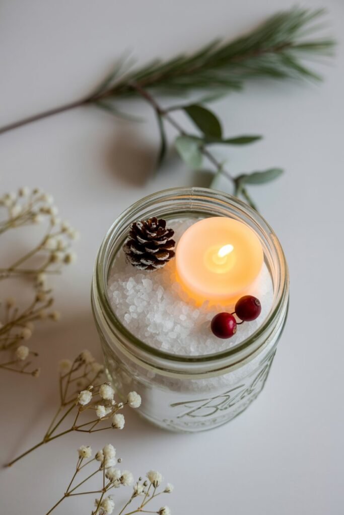 - Fill a mason jar halfway with Epsom salt or faux snow.