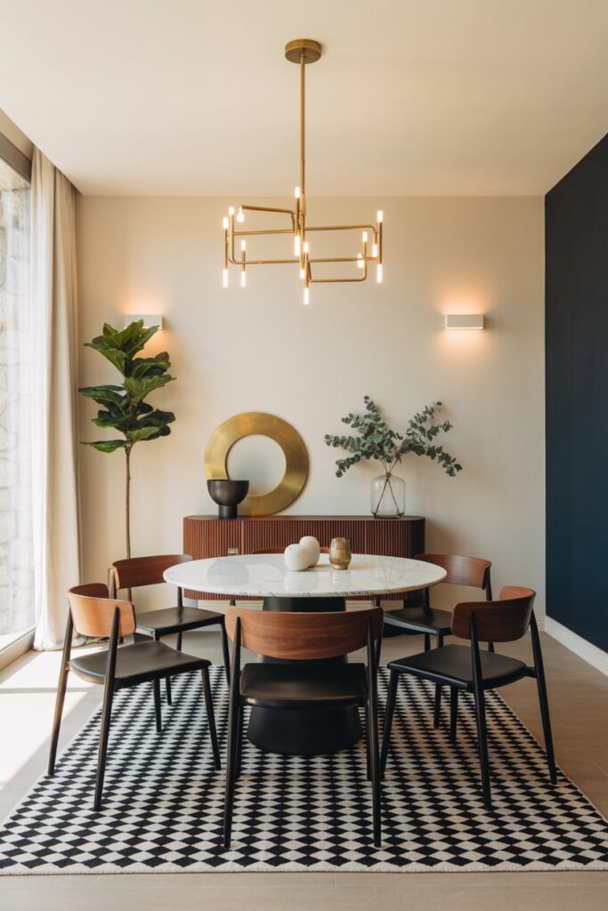 Modern dining rooms are not afraid of a little drama. Black metal chairs, a black statement mirror, or a black-and-white rug can add just enough edge without making the space feel heavy.