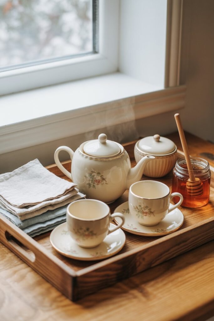 Setting up a tray with teapots, mugs, and little jars for sugar and honey sticks makes it both functional and visually appealing.