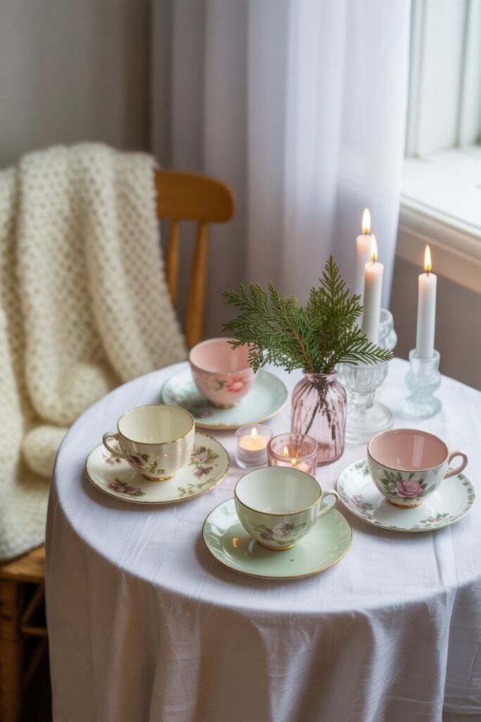 Mixing mugs, teacups, and plates you already own creates a charming, lived-in feel. Add napkins or small linens to elevate the look.