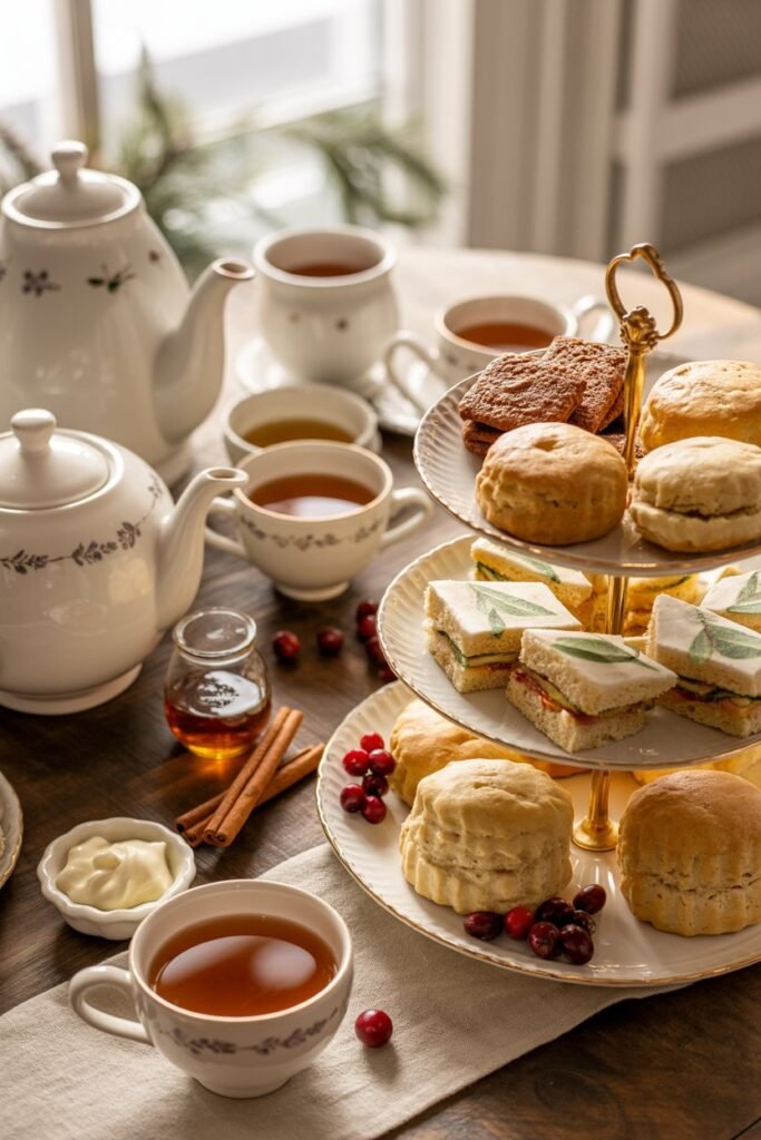 Think scones, spiced cookies, finger sandwiches, or even store-bought pastries arranged neatly on a tray or tiered stand.