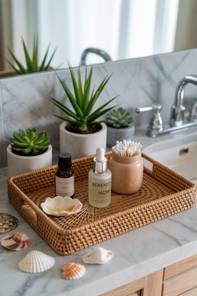 Think seashells in a glass jar, smooth decorative stones, or a small wooden tray — little touches that make the space feel intentional and inviting.