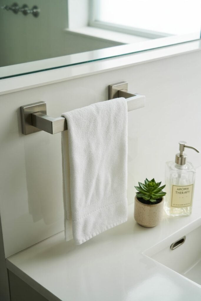 If your small bathroom countertop doesn’t leave room for a hand towel, don’t stress—just take it to the wall. A slim towel rack or hook above or beside the sink keeps your towels handy without eating up precious counter space. It’s practical, space-saving, and adds a touch of style at the same time.