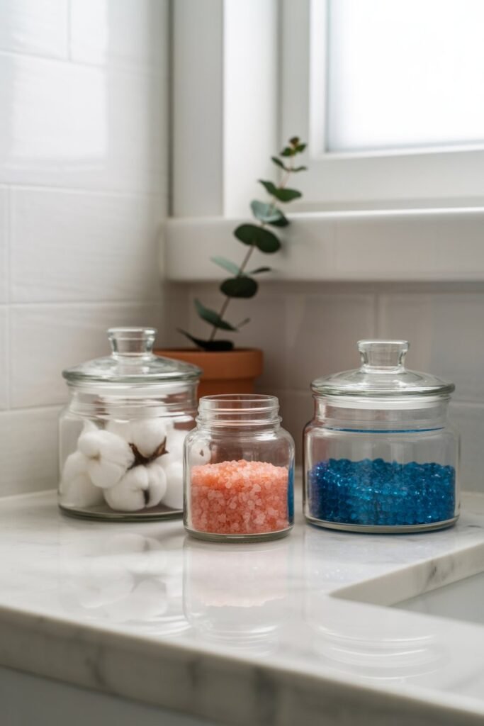 Clear glass jars give you that clean, uniform spa vibe, while tinted or patterned jars add a pop of personality and color to the space. The best part? They’re super easy to swap out if you ever want to change your bathroom’s look.