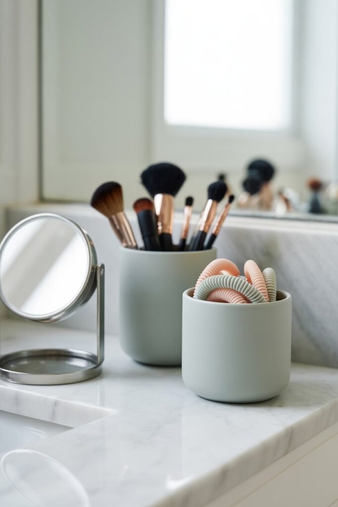 If your beauty products are slowly taking over your countertop, it’s time to give them a home that looks as good as it is practical. Using uniform storage—like matching glass or ceramic containers—instantly makes your space feel tidy and intentional. Whether it’s cotton swabs, makeup brushes, or hair ties, keeping them in coordinated jars or canisters adds both style and function to your bathroom.