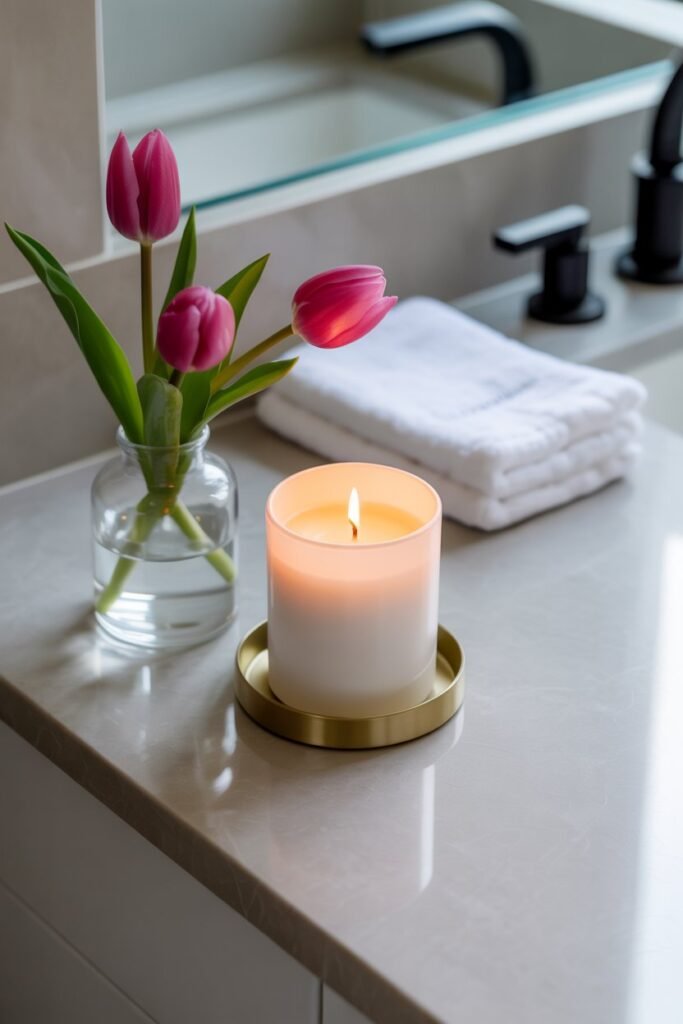 A decorative candle instantly adds warmth and charm to your bathroom countertop. Whether you light it during a relaxing bath or simply let it sit as a stylish accent, a beautifully designed candle in a chic holder can completely elevate the mood of the space. It’s a small detail that makes your bathroom feel cozy, intentional, and spa-like.