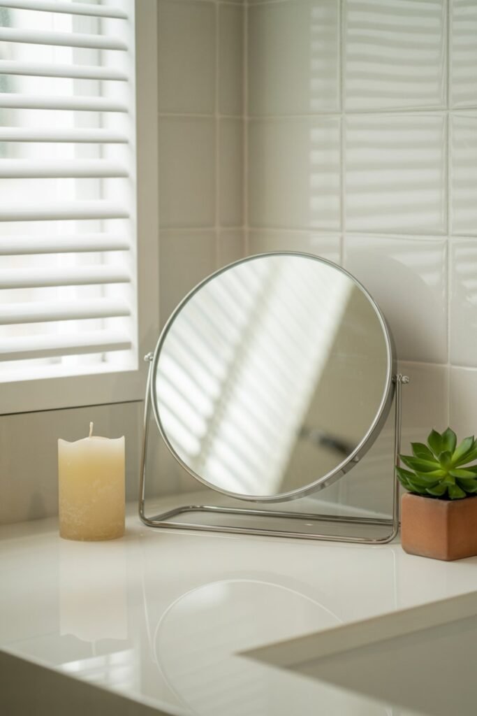 A vanity mirror is one of those small upgrades that can totally transform your bathroom countertop. Not only is it practical for everyday use, but it also doubles as a stylish accent piece. A sleek mirror with a marble or metal base adds elegance, reflects light, and makes the space feel brighter and more open. It’s a simple touch that instantly elevates your bathroom.