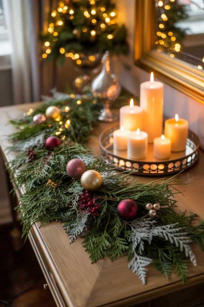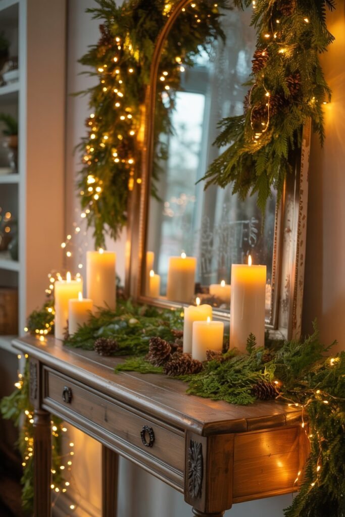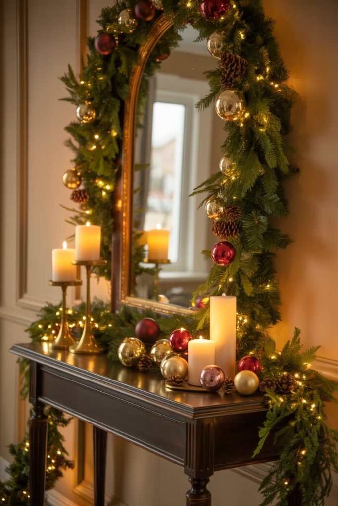 - Place your mirror above a console table layered with garlands, candles, and ornaments