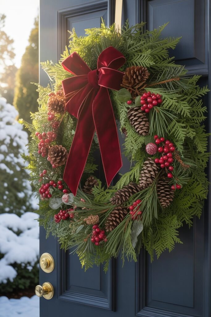- Artificial Evergreen Wreath – Realistic pine with berries and pinecones