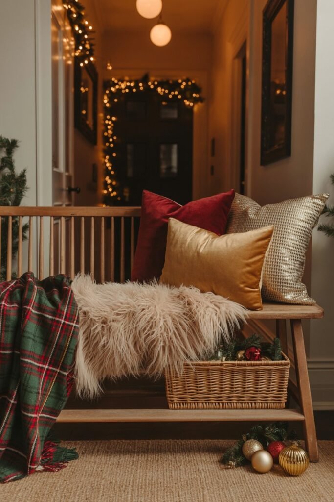 Why it works: Guests can sit, remove boots, or drop off bags, all while admiring your festive décor.